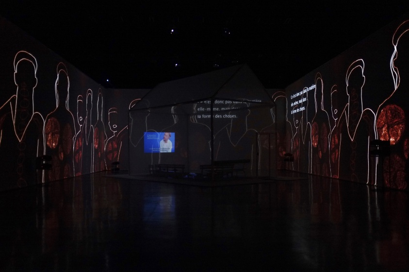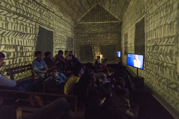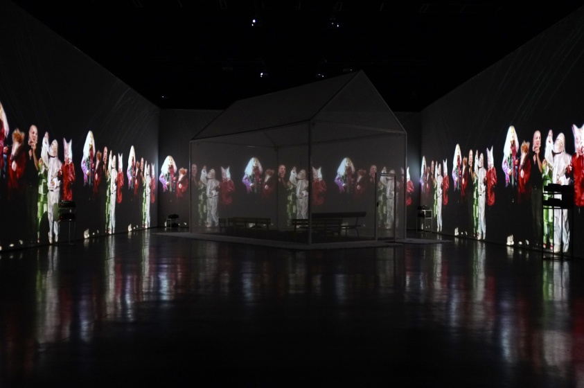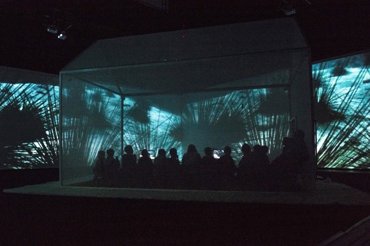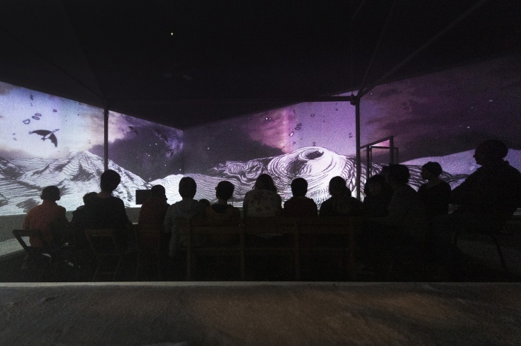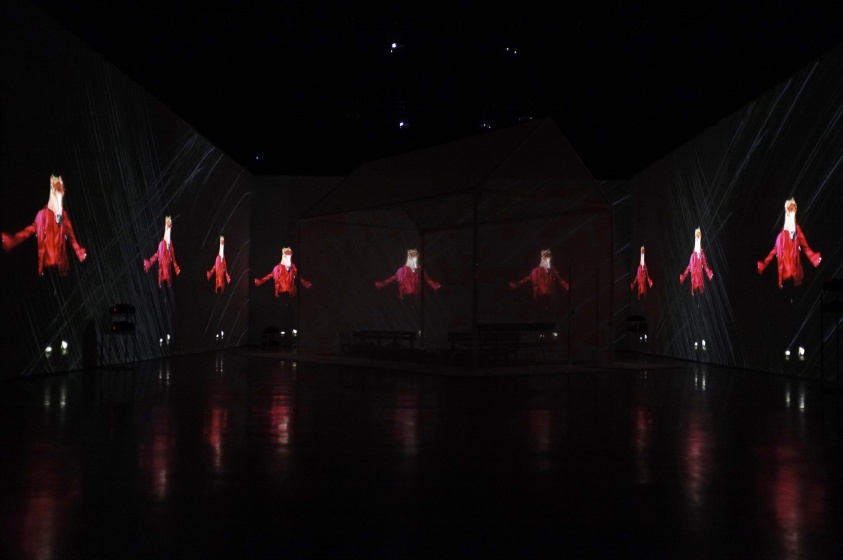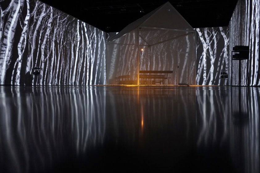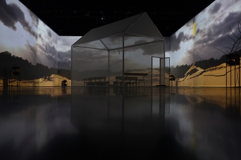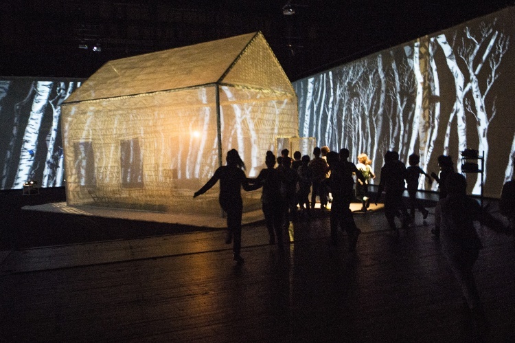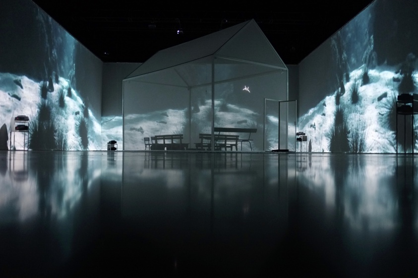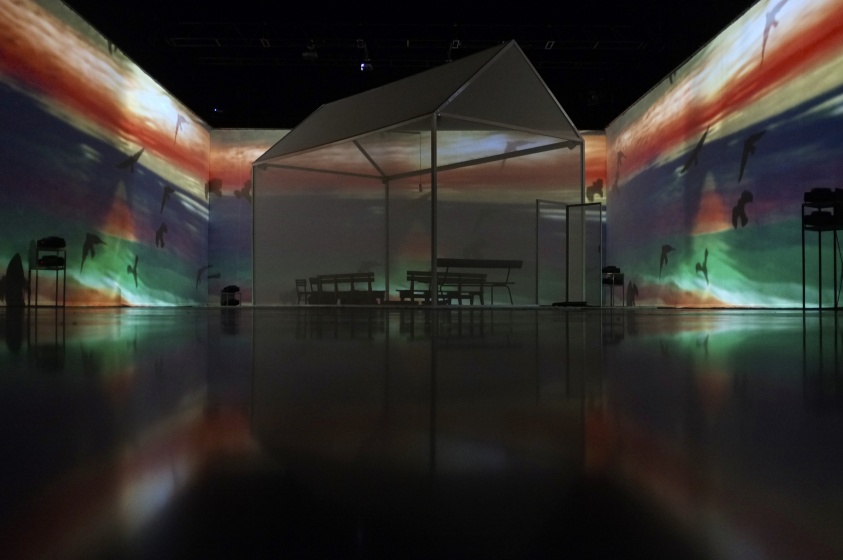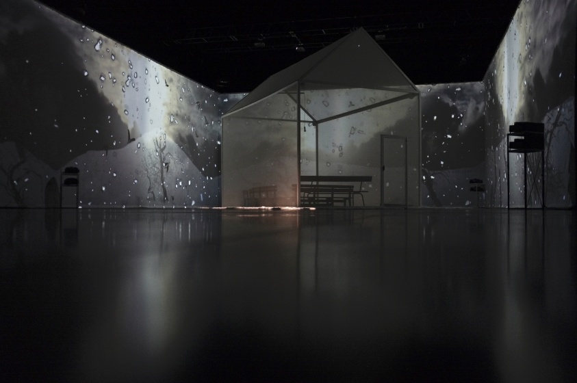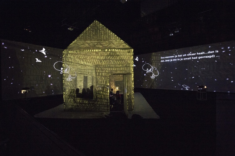 " Geen acteur te zien in de zaal van Theater de Veste in Delft. Alleen een huis met muren en dak van doorzichtig doek. Daar kunnen dertig mensen in. Op de wanden van de zaal daaromheen trekken geprojecteerde beelden in wervelende vaart voorbij. Dat is fascinerend: gewoonlijk, als je in een huisje zit, sluiten de muren je af van de omgeving, maar deze keer geven ze juist uitzicht op een wereld zo groot en prachtig als je nooit meemaakt in het gewone leven.
