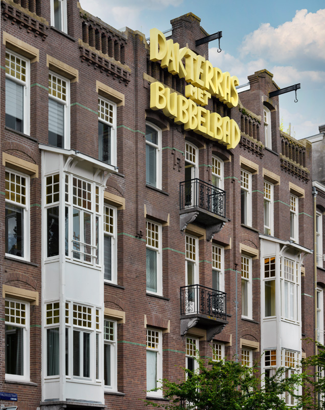 Welcome Stranger heeft vier kunstenaars gevraagd een kunstwerk te maken op de gevel van hun eigen huis. 'Dakterras met Bubbelbad' is een kunstwerk gemaakt door Lily van der Stokker.