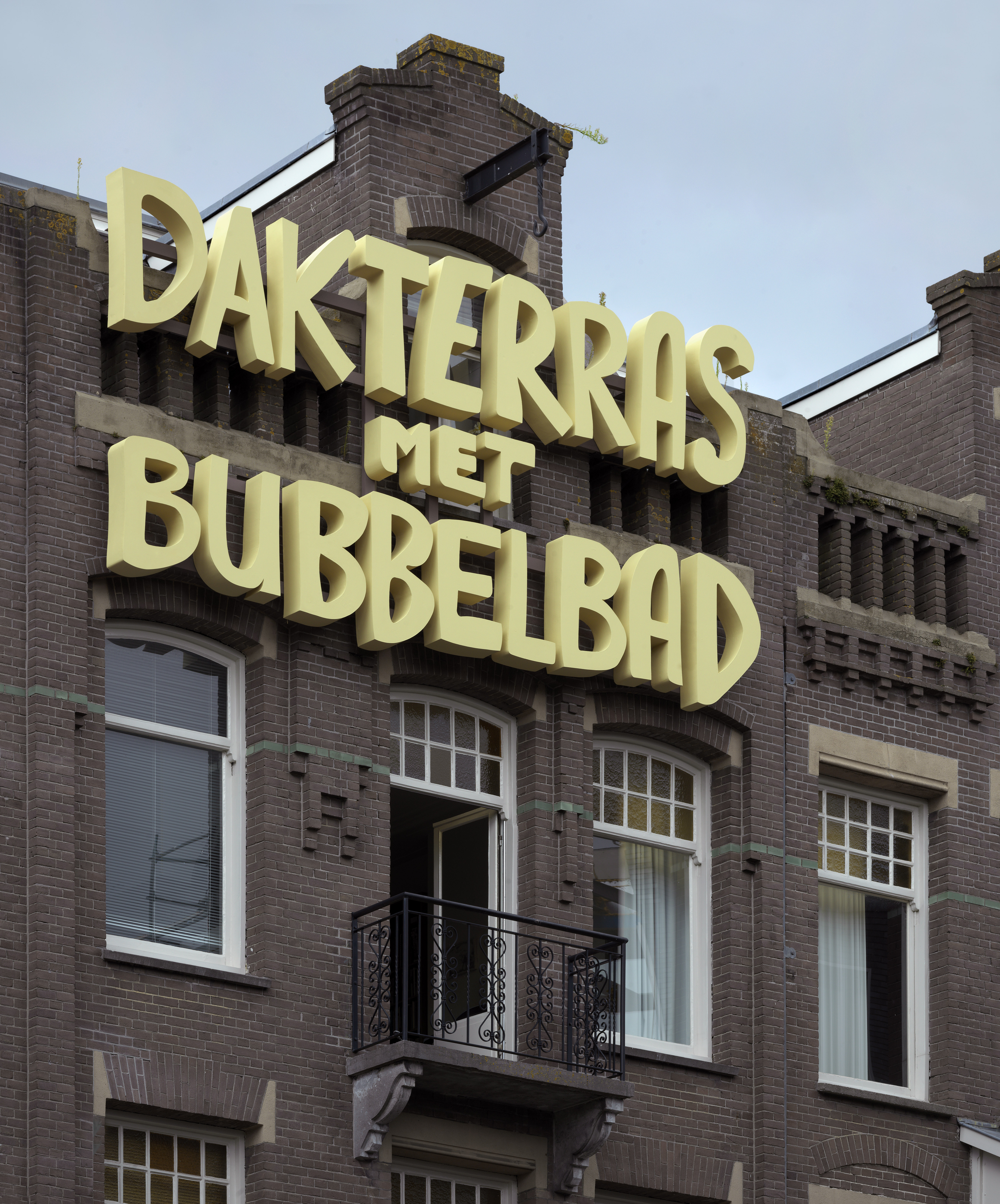 “Dakterras met Bubbelbad” is een kunstwerk. Het is een werk van een persoon op één huis. Het is een kortstondige uiting van concrete poëzie. Politiek, grappig en brutaal.